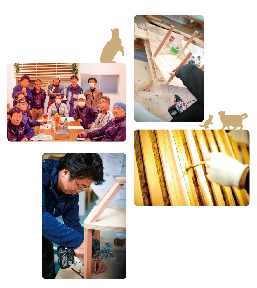 そのような背景の中で私が考案したのが、猫部屋リフォーム専門店「きじとら」。育成途中である若手の大工職人たちが一人前になるまで、高齢の職人たちが活躍できる場所として「猫の遊び場」に携わっていただいているのです。一般的な工事現場よりも遥かにリスクがなく、培った経験知識を存分に発揮でき、末永く仕事に取り組んでいただける。お互いに嬉しいことがあるこの事業は現在着実に成長を続け、年々、受注も増加しております。